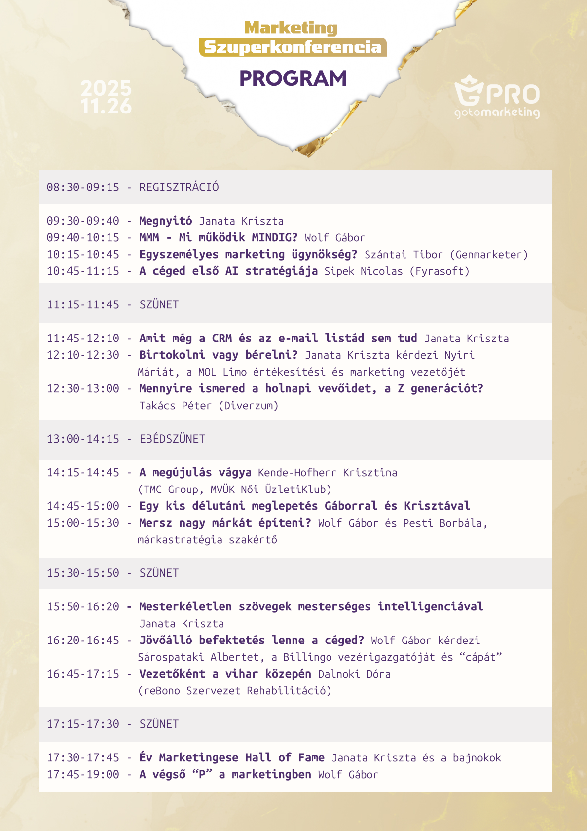 Idén is rengeteg programmal készülünk! Lesznek izgalmas előadások, Év marketingese beszámolók, közte meg azok a bizonyos SZÜNETEK, amik tudjuk, mennyire fontosak – szóval korán kezdünk és jó sokáig fogjuk bírni.